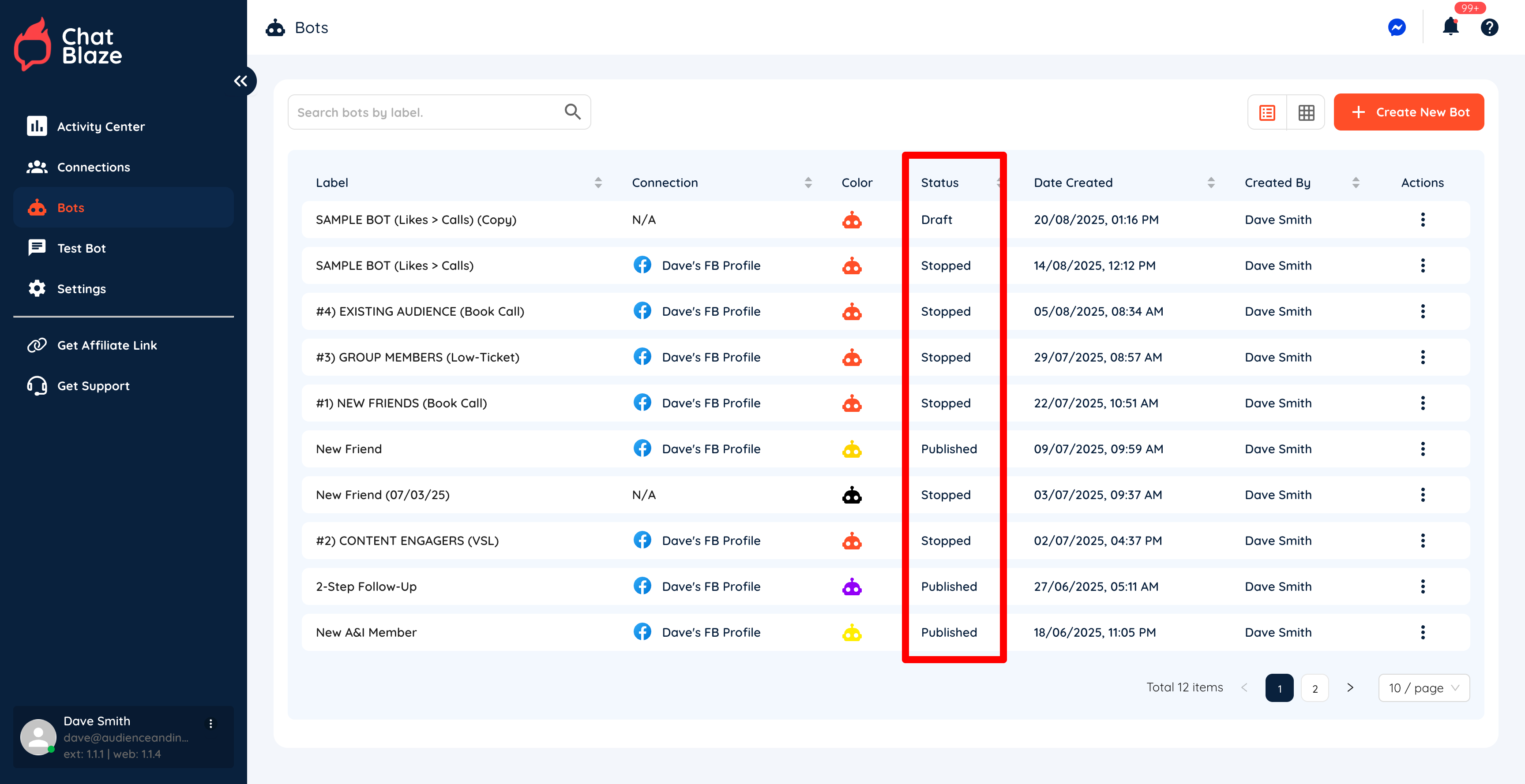 The "status" of your bot will determine how your bot functions and whether or not it counts towards the total bot limit in your ChatBlaze account.