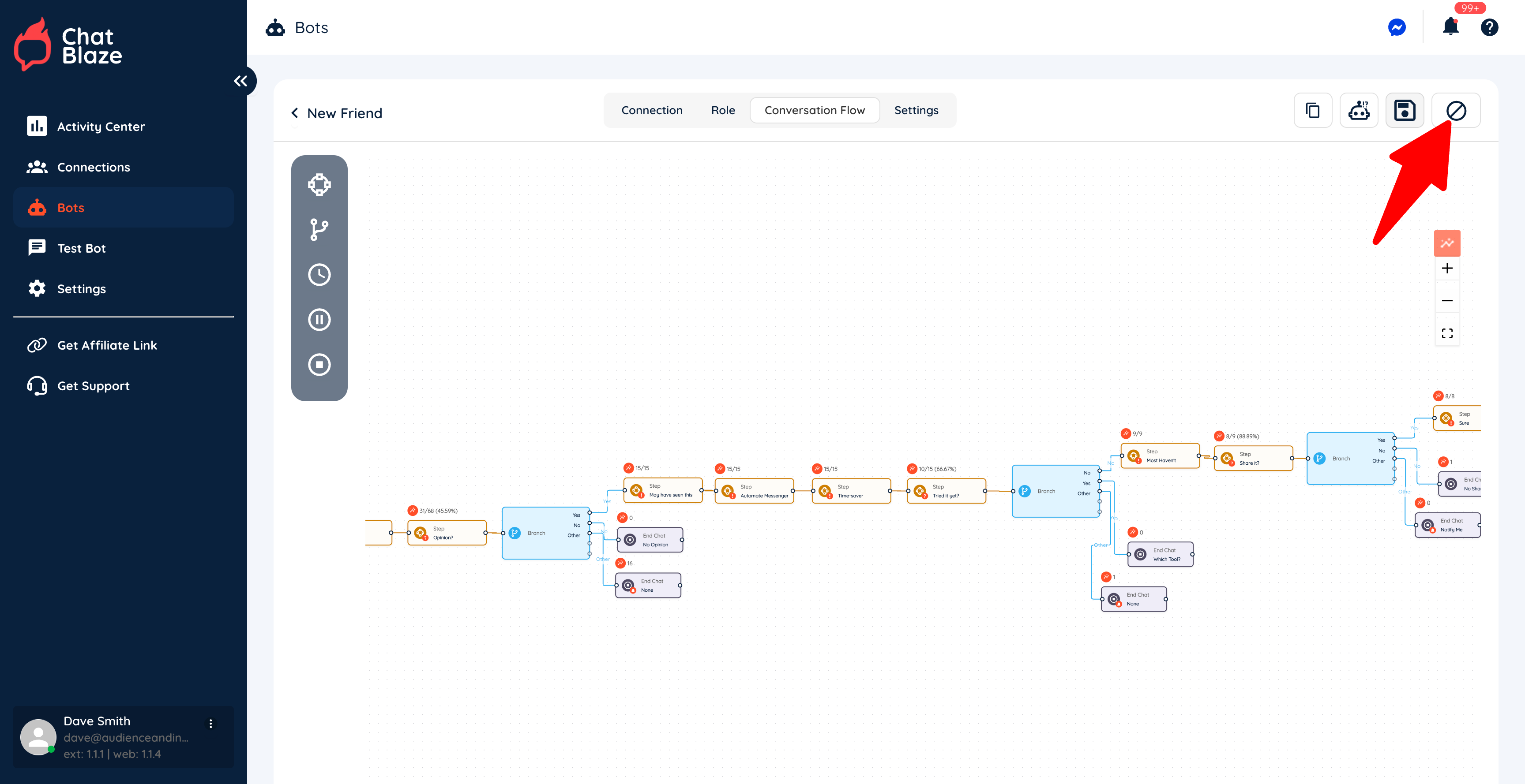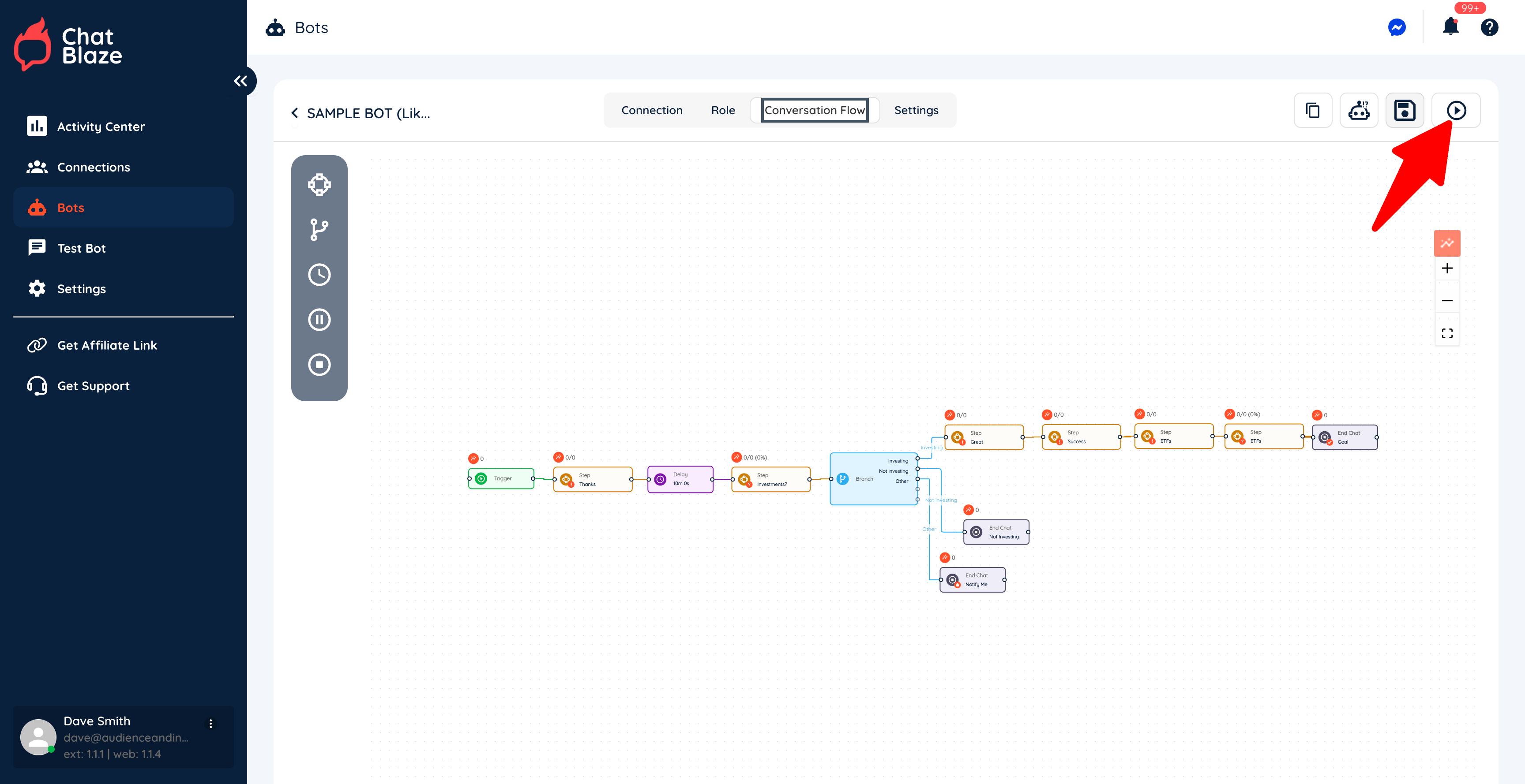 If you want to start your bot again so that it will begin conversations with new leads, you can click the play button: