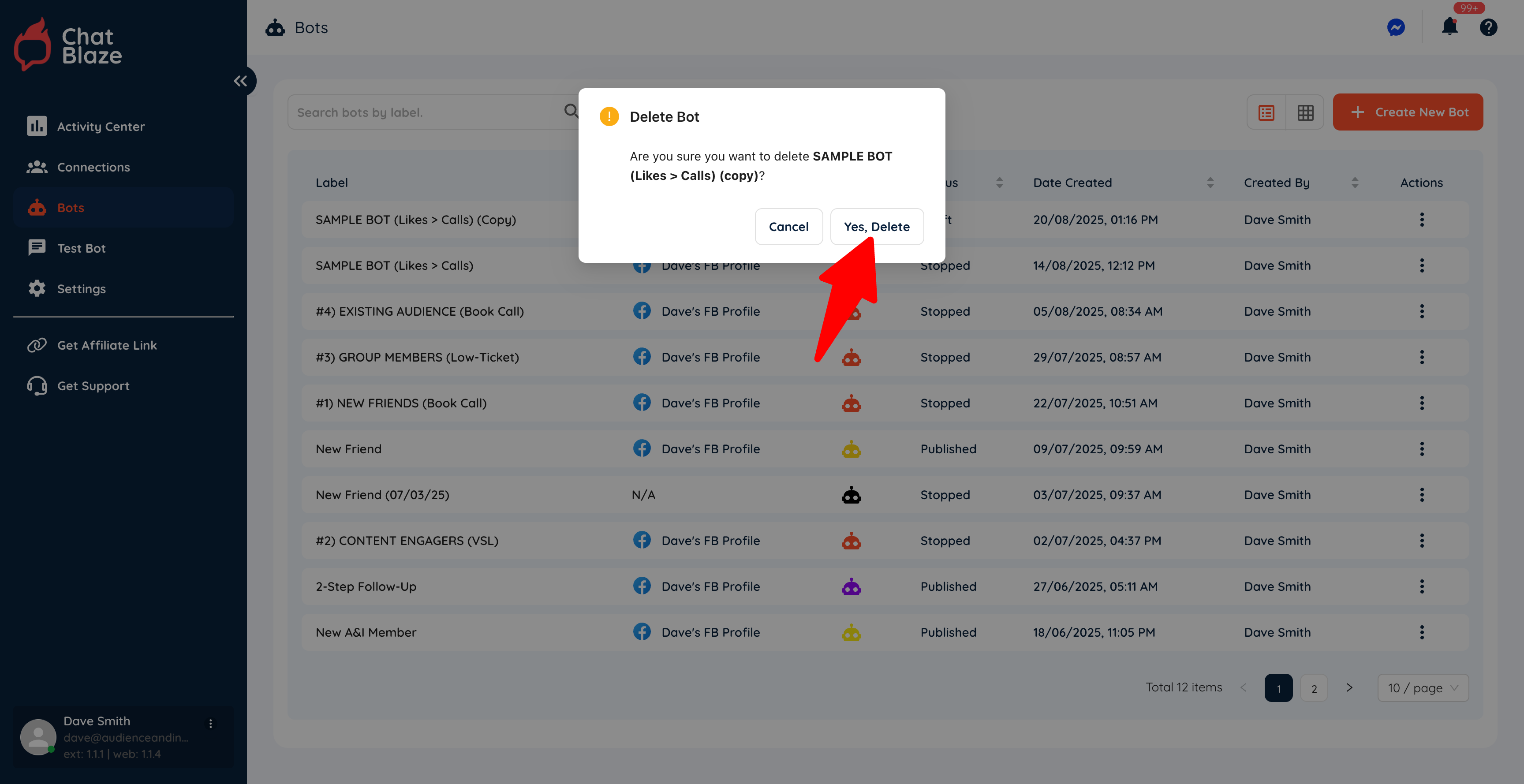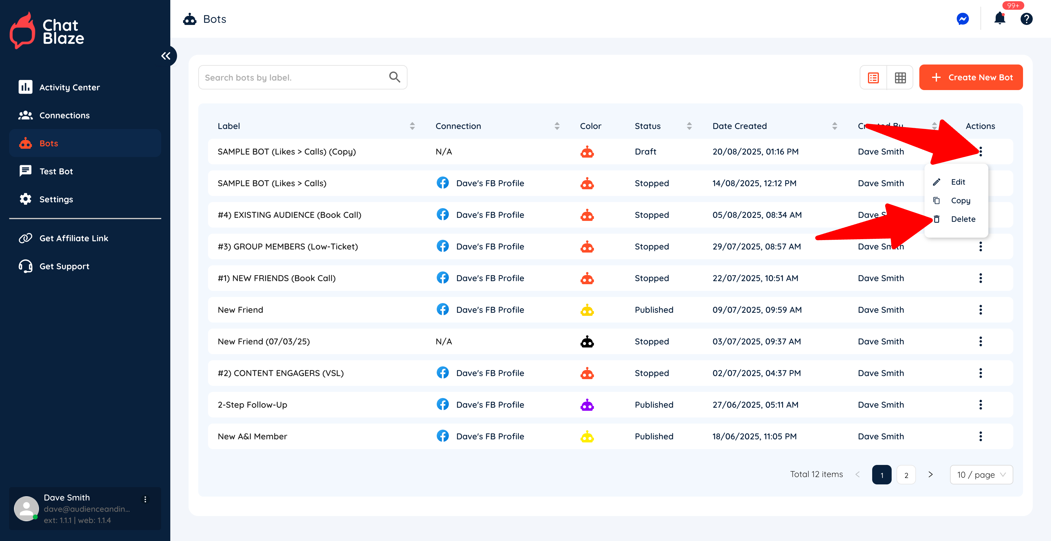 From the "Bots" tab, click the 3 dots beside the bot you'd like to delete, then click the "delete" button: