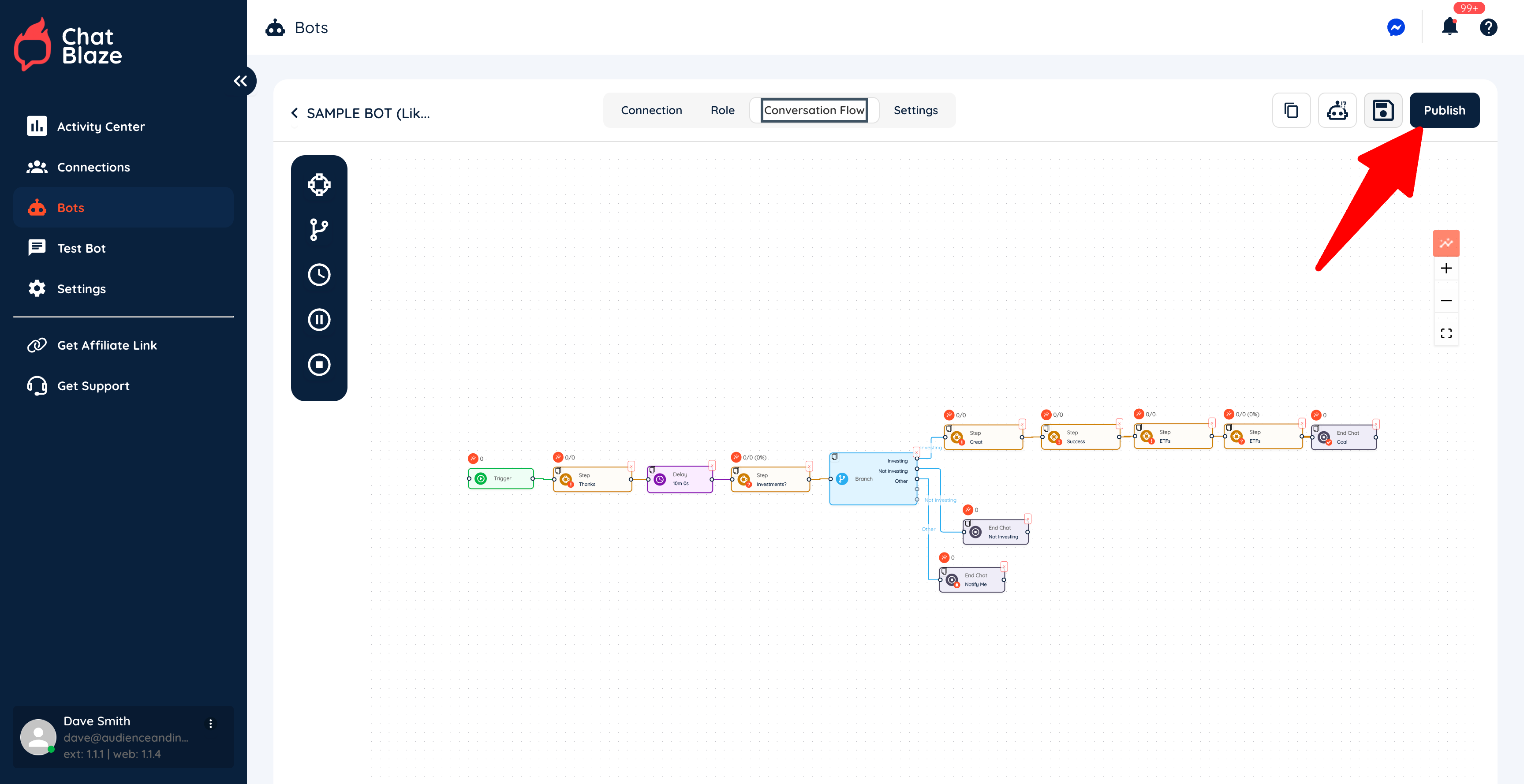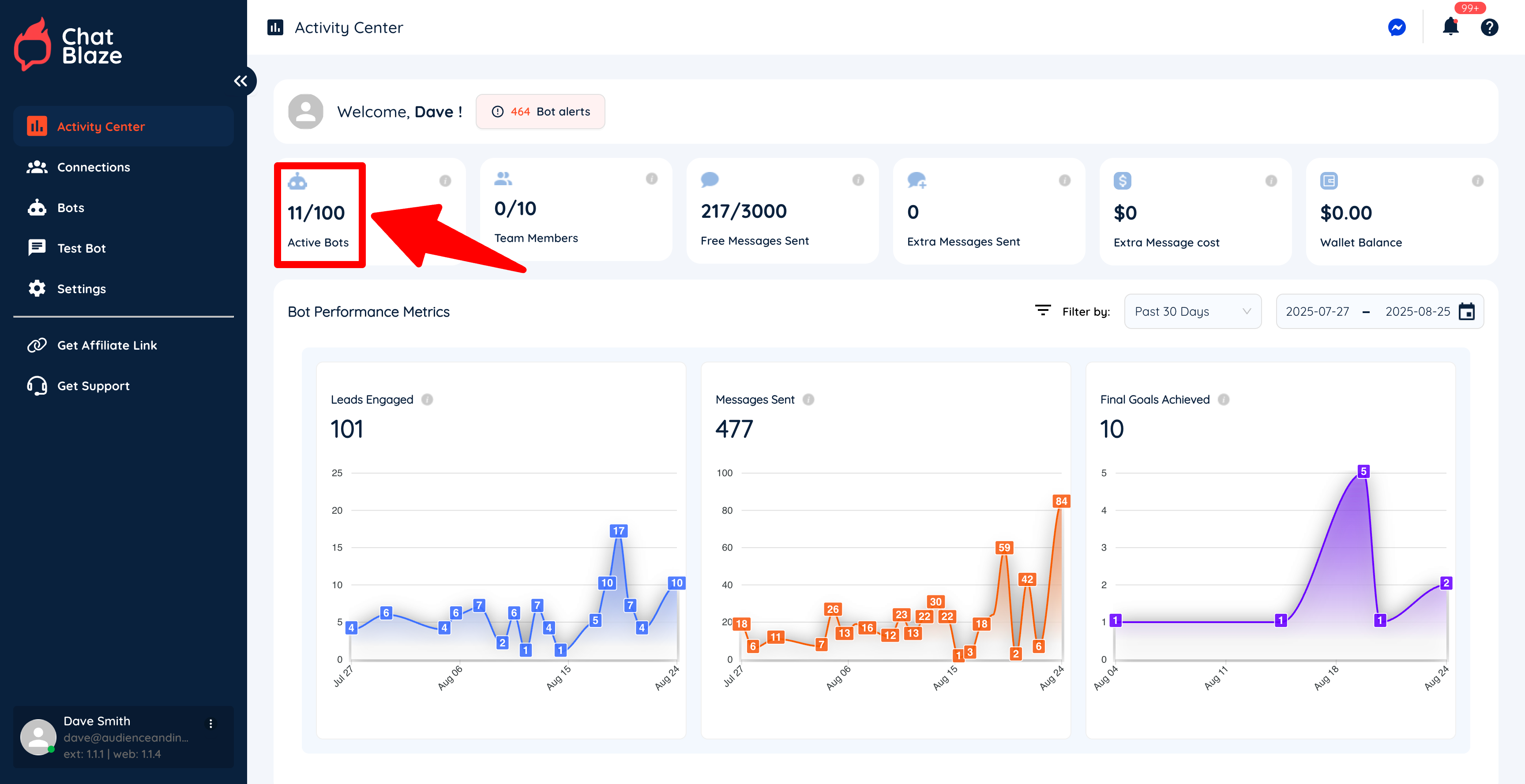 You can find your bot limit from the "Activity Center" inside ChatBlaze. In this example, the account has a limit of 100 active bots. Once you reach your bot limit, you will not be able to publish any more bots.