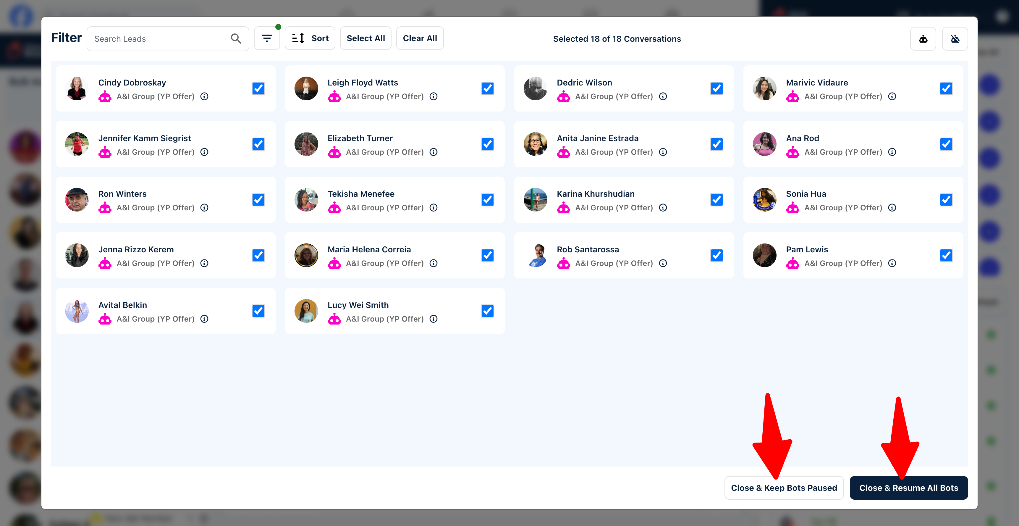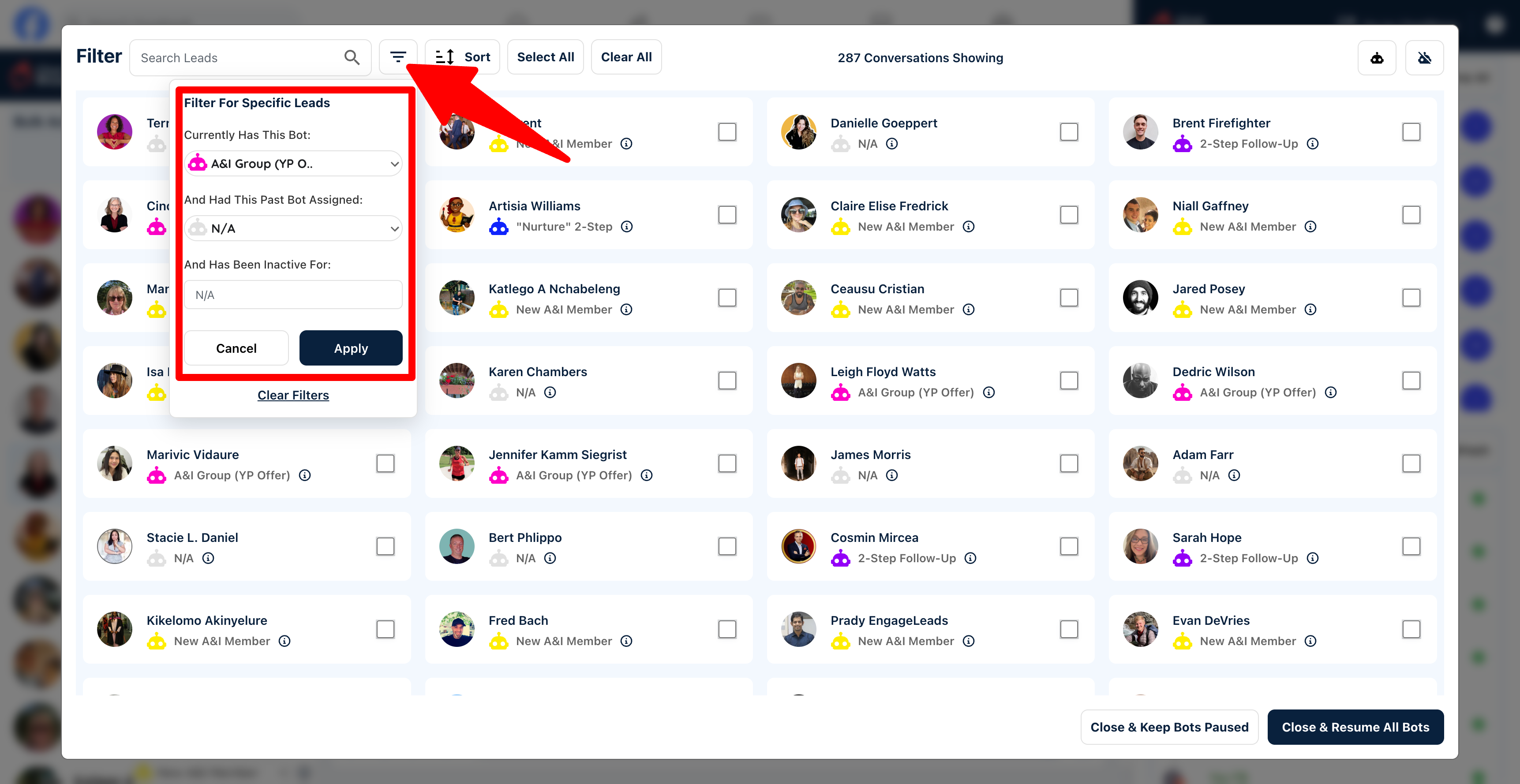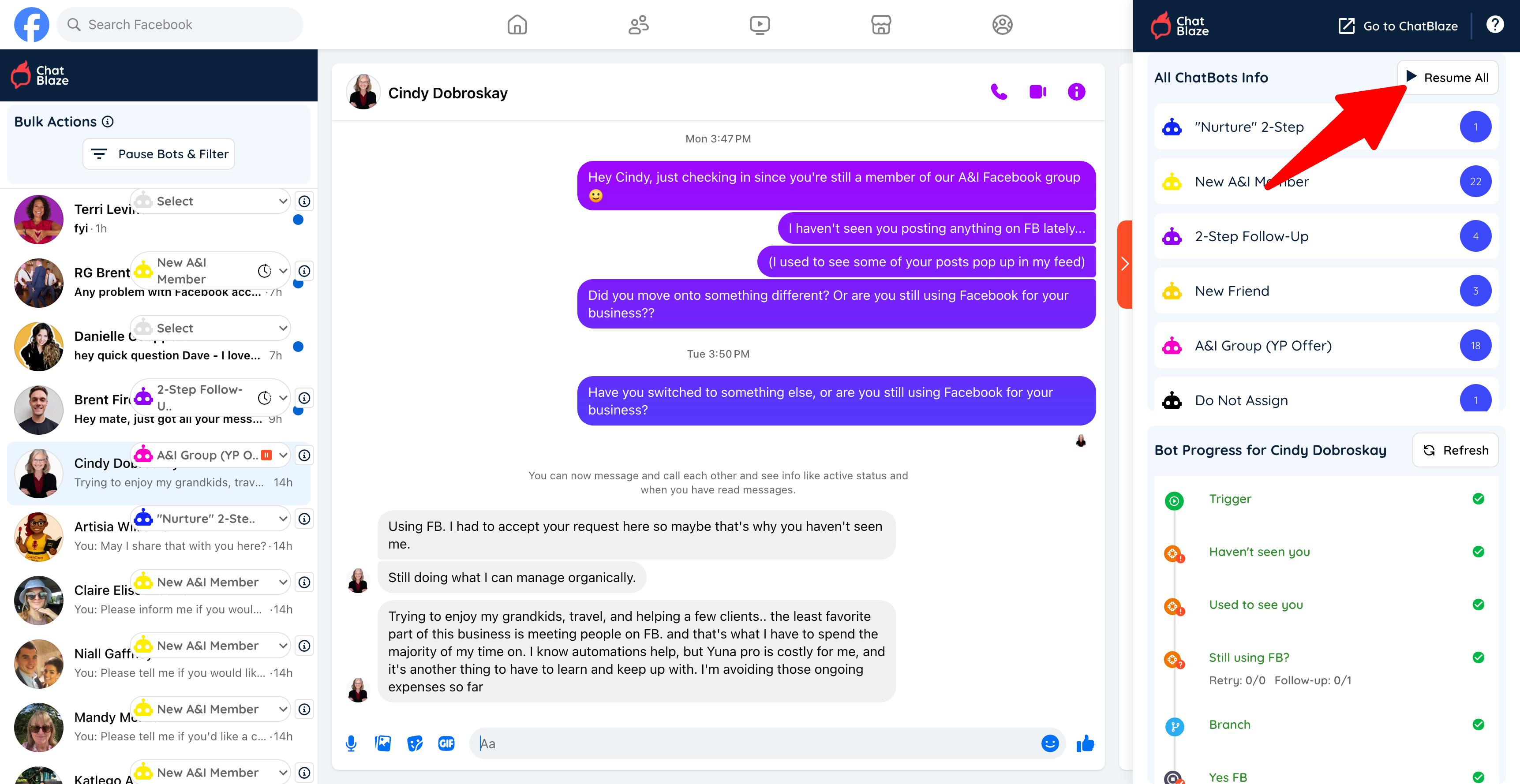 8) Once resumed, your bots will begin chatting with the leads they are assigned to.