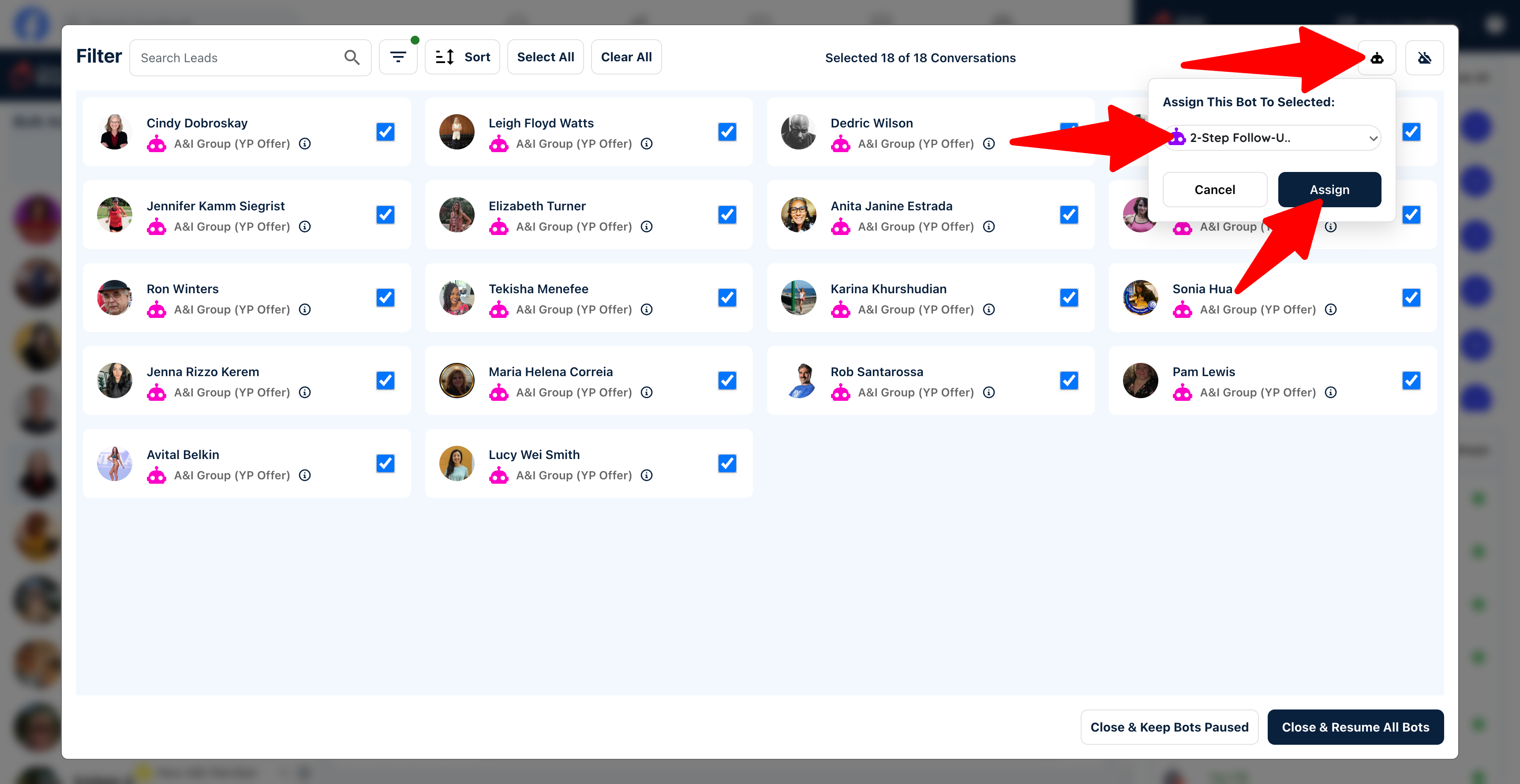 5) Click the icon to assign a bot to these leads, then choose the bot you want to assign from the drop-down menu. Note: As soon as you click "Assign" the bots will be assigned, so make sure you've chosen the correct bot.