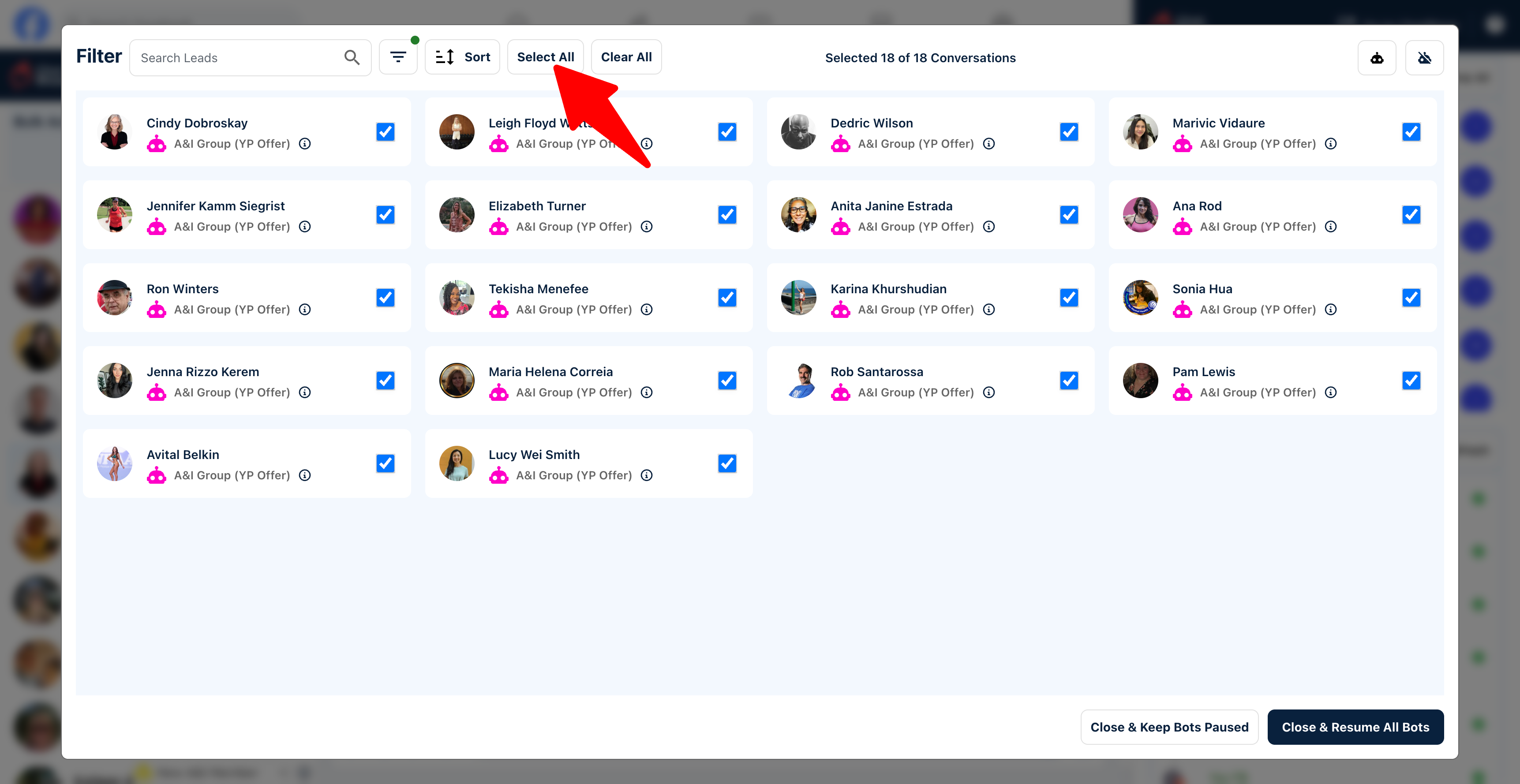 4) Select your leads manually by clicking the box next to their photo or use "Select All" to select every lead.