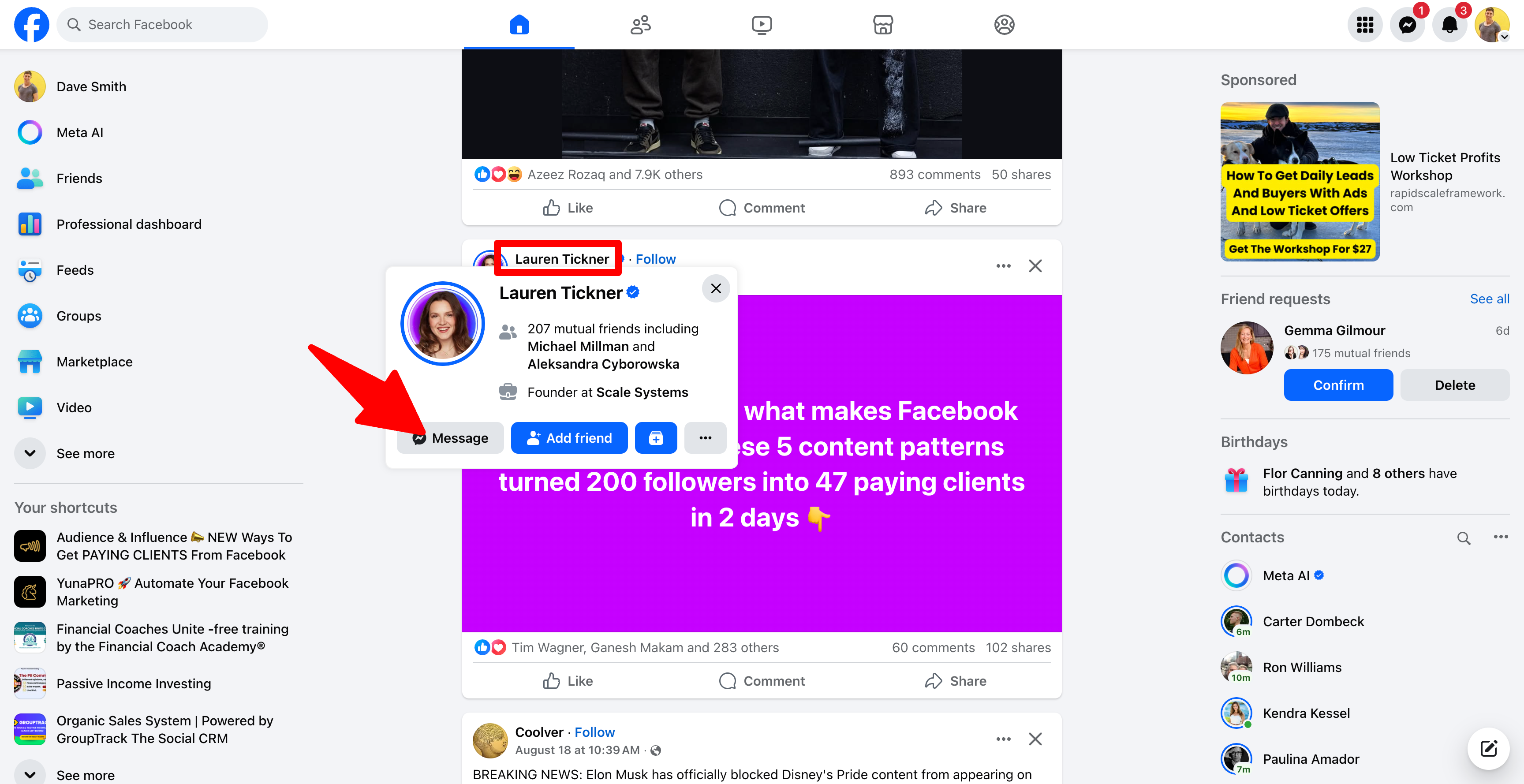1) Alternatively, you can find a lead anywhere on Facebook (i.e. in your feed, in your friends list, in your group, in any other group, etc.). Hover over their name and click the "Message" button to start a Messenger conversation with that lead.