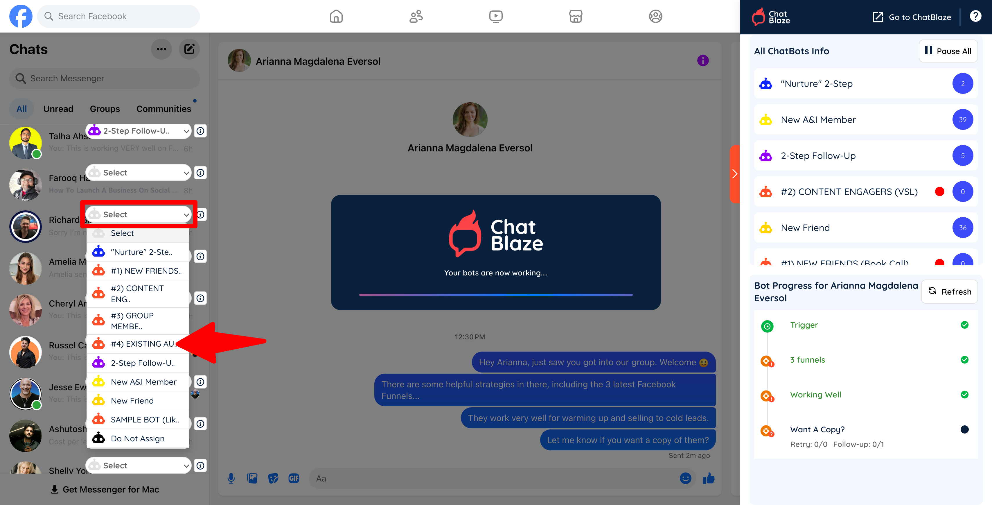 1) If you are already in a DM conversation with an old lead, you can find them in your ChatBlaze Messenger window, click the "Select" dropdown beside their name, and manually assign a bot to them.