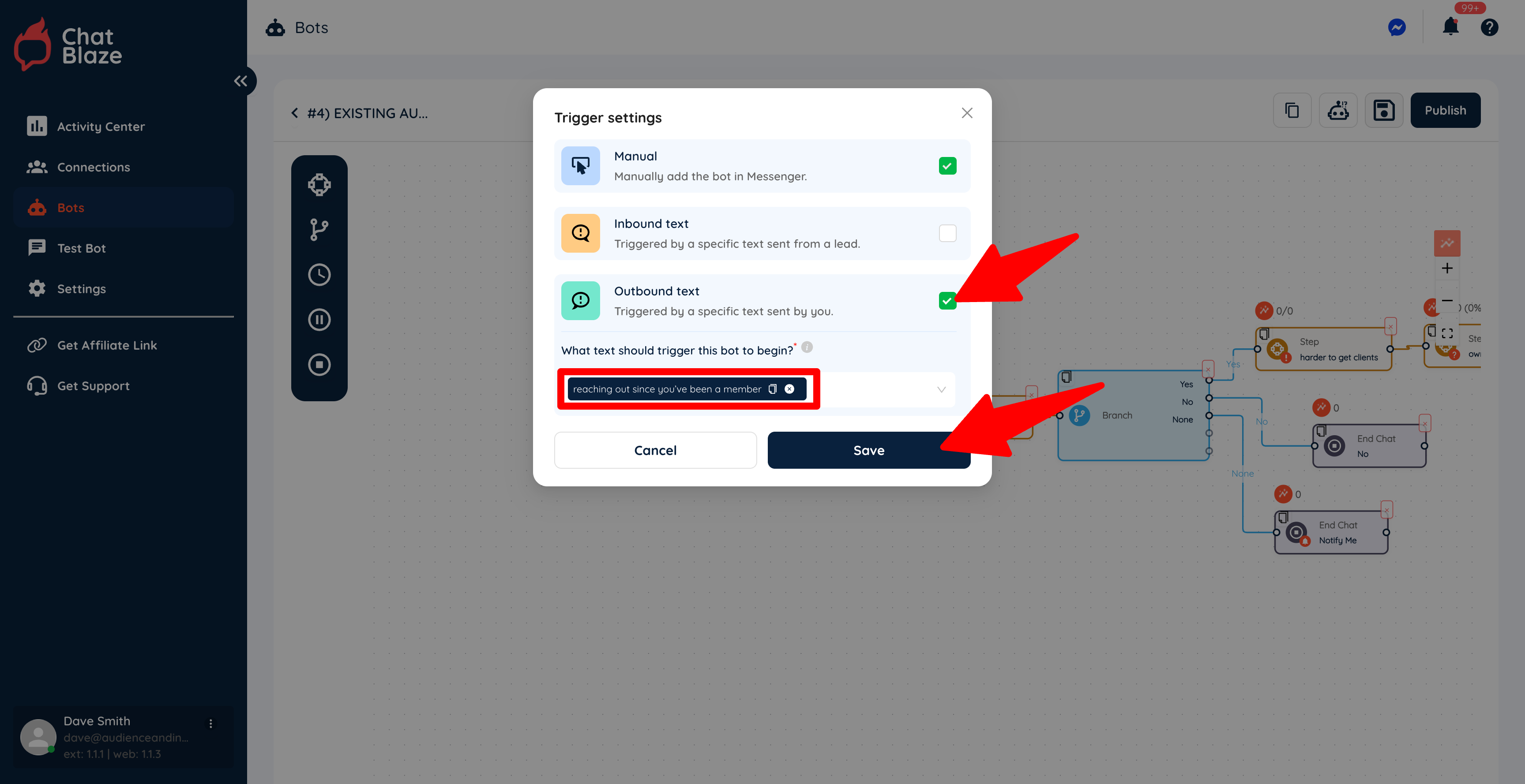 5) Select "Outbound text" and then enter the text that you want to use to trigger your bot. Save this setting.
